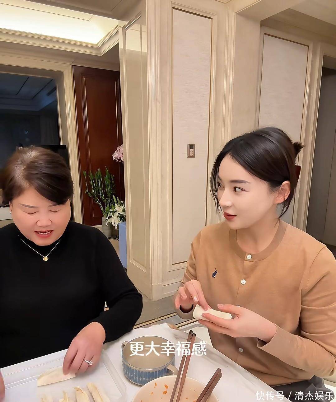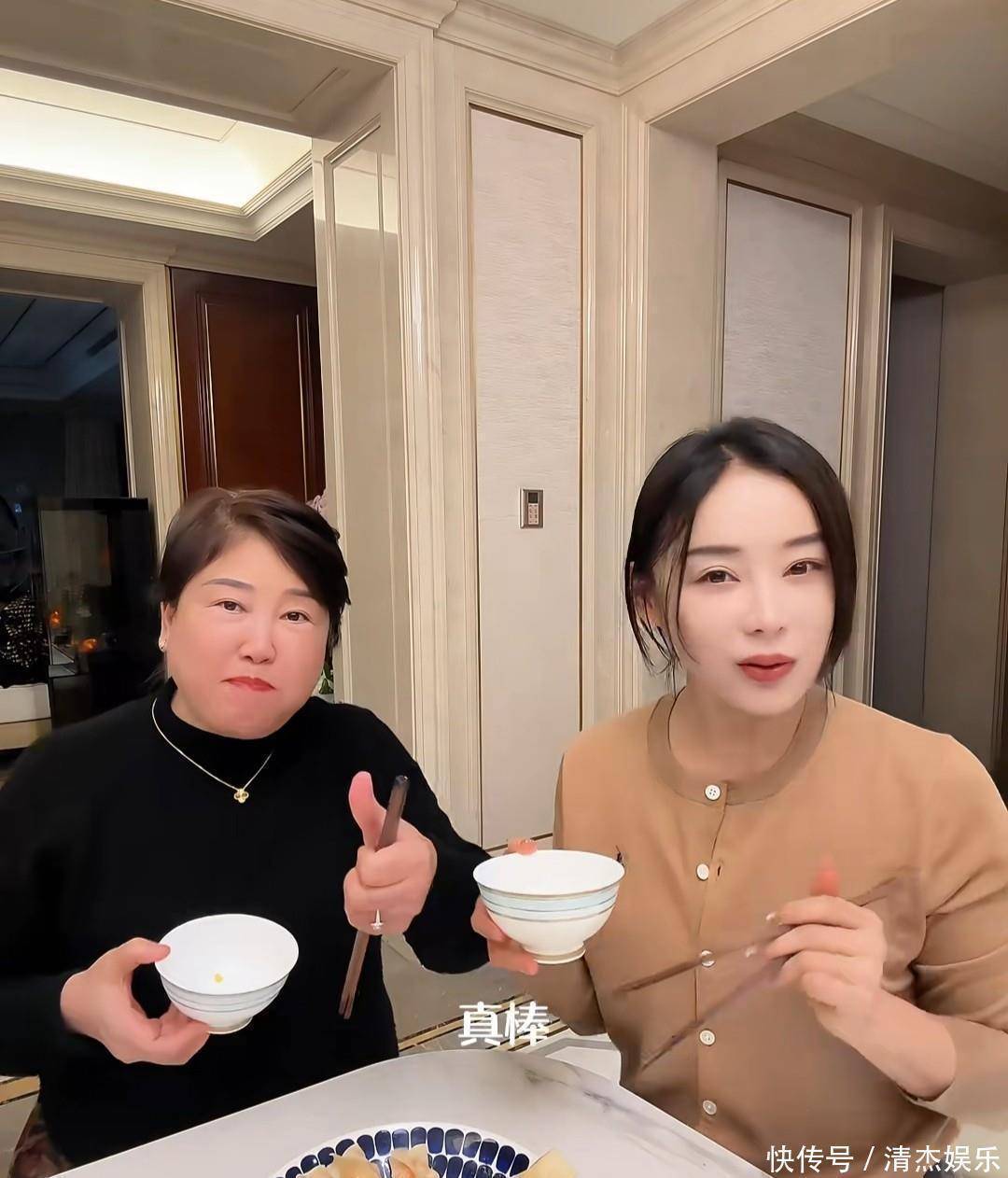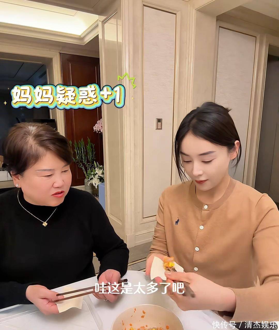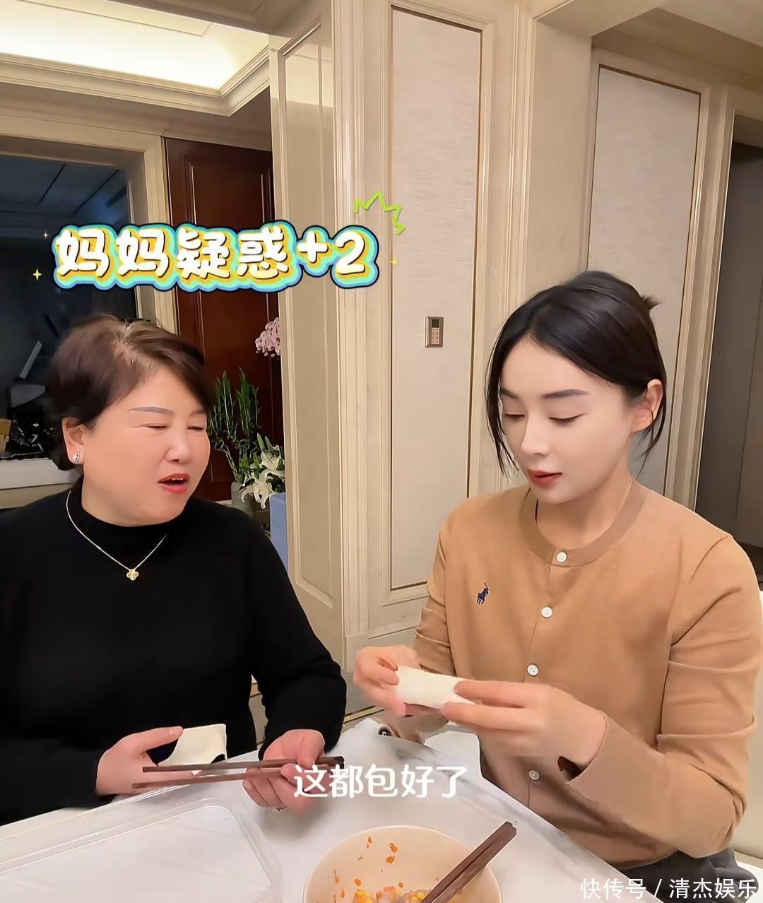 然后母女两人开始在餐厅的餐桌上包蒸饺。通过图片背景可以看到,餐厅面积很开阔,房屋装修风格精致而大气;袁姗姗的母亲体态丰腴,虽然稍胖,但她皮肤白皙,妆容精致,身上戴着耳环项链,左手无名指上的大钻戒很是显眼,人看上去富态十足。