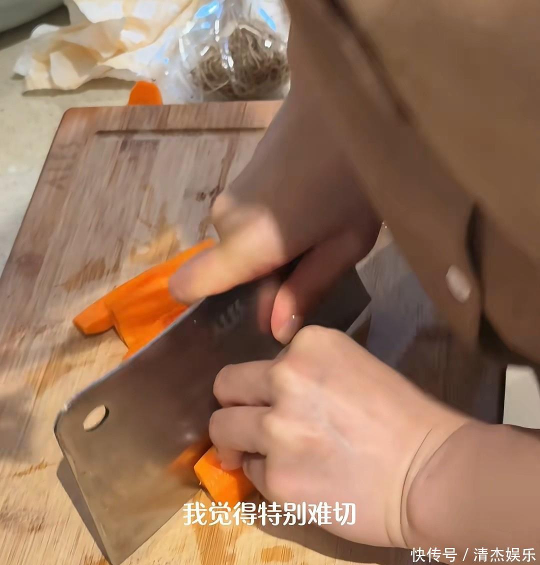 在第一步准备食材切菜的时候,袁姗姗就遇到了难题,胡萝卜太硬她那五指不沾阳春水的手切不动,