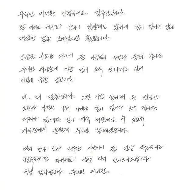 11月20日,韩国男星金宇彬通过一封手写信向公众官宣了一个让粉丝们期待已久的消息——他即将与相恋多年的女友申敏儿步入婚姻的殿堂。